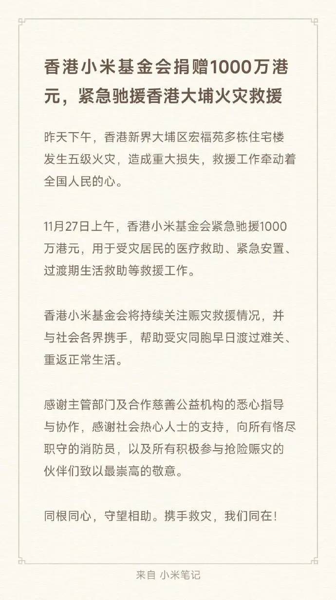 11月27日,雷军发文表示,香港小米基金会捐赠1000万港元,紧急驰援香港大埔火灾救援。祈愿逝者安息、伤者康复,受灾同胞早日渡过难关。
